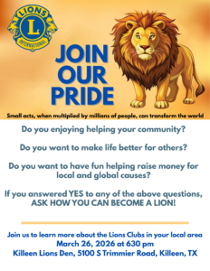 The Lions District MD2-X3 will be sponsoring an event on March 26, 2026 at 6:30 PM at the Killeen Lion’s Den at 5100 S Trimmier Road in Killeen. The Lions Clubs from the Killeen/Harker Heights/Copperas Cove area will be participating. Learn about who Lions are, what Lions do, and how each of the various clubs in our community serve our community.