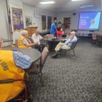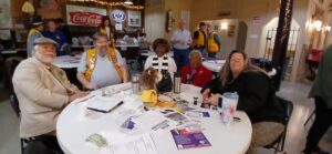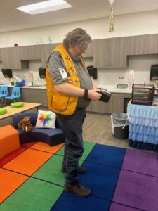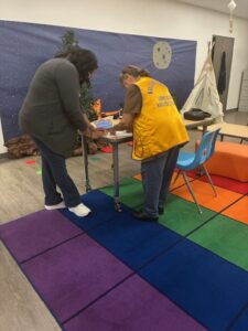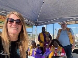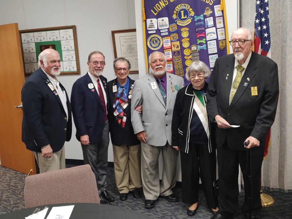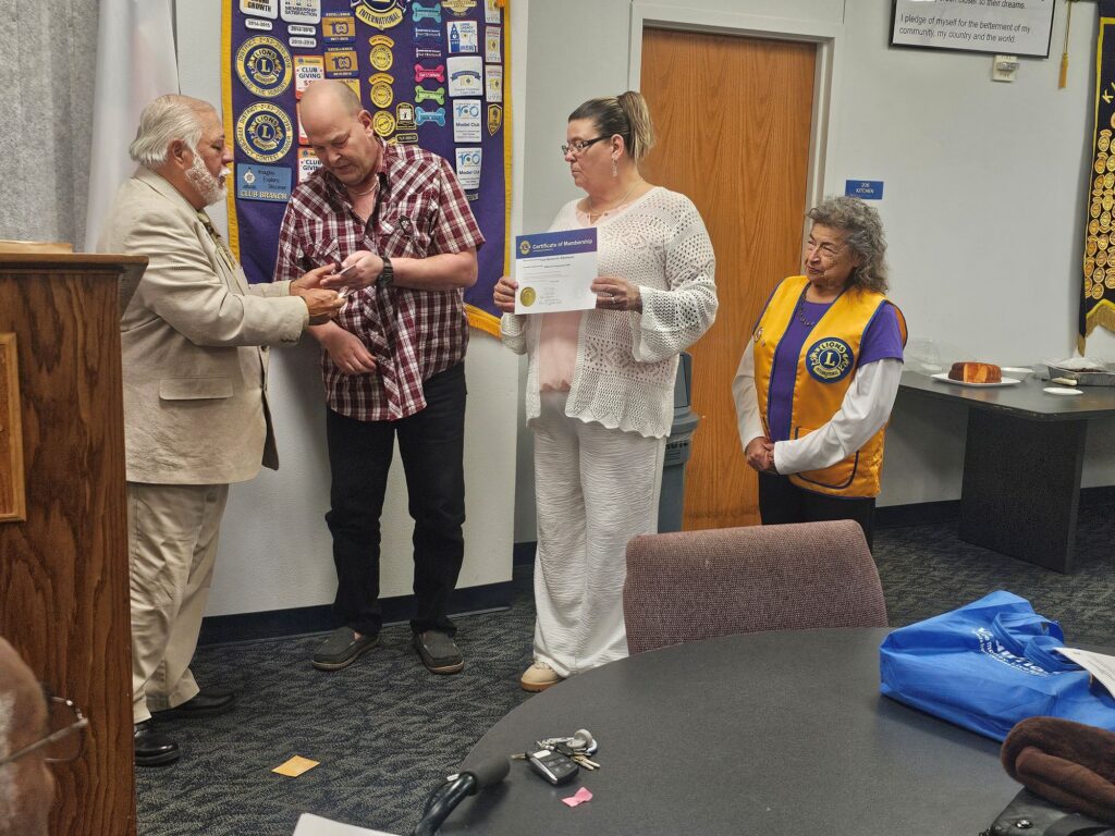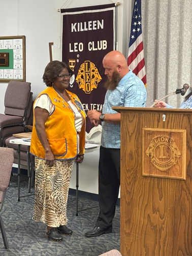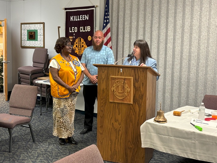 New member Kirsten Ellerbrock is being inducted as a new member of the Killeen Evening Lions Club. PDG Lawrence Sanchez is the induction officer. Lion Sylvia Sanchez is her sponsor. Lion Kirsten’s Partner William Karlson is preparing to pin Lion Kirsten.