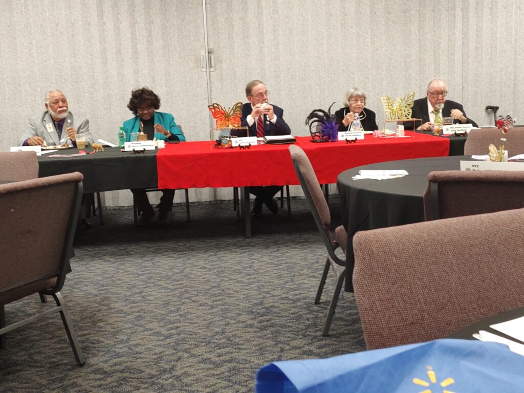 The head table with (from left) Master of Ceremonies PDG Lawrence Sanchez, President Sharon Jackson-Smith, Guest Speaker PCC John Landrum, Partner in Service Athalie Southard, and PDG John Southard, the last remaining Charter Member for KELC