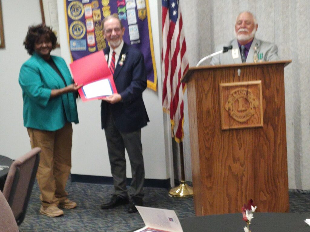 President Sharon Jackson-Smith presenting a Certificate of Thanks to Guest Speaker PCC John Landrum from Waxahachie with Master of Ceremonies PDG Lawrence Sanchez at the podium.